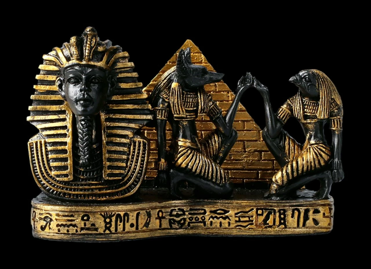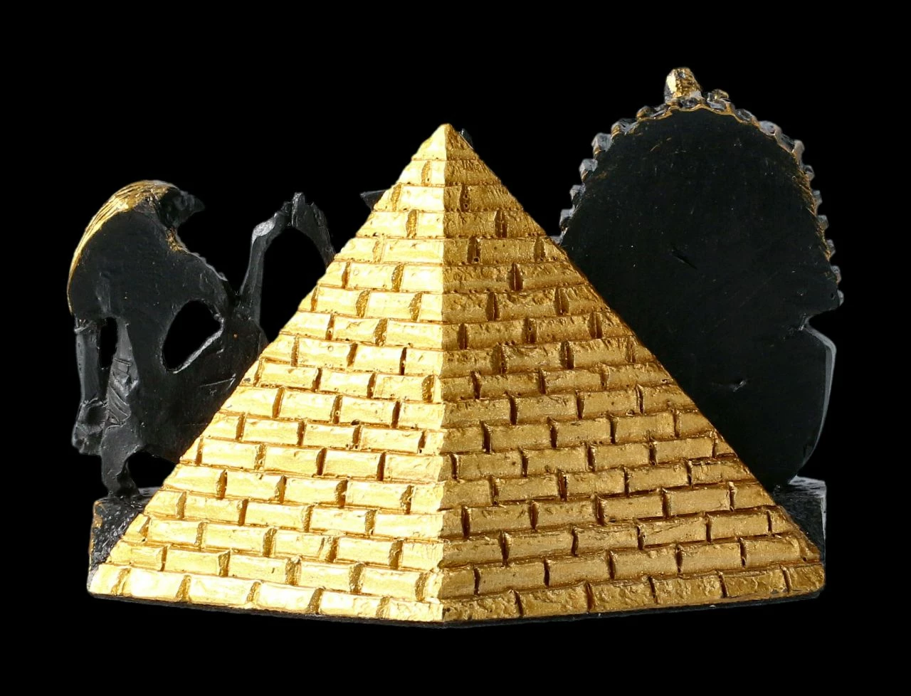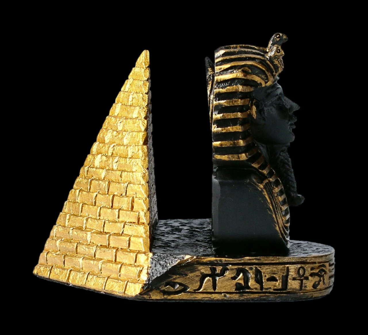 Nicht nur Ägypten Fans werden von diesem großartigen, schwarz- und goldfarbenen Visitenkartenhalter aus detailreich gefertigtem und fein handbemaltem Kunststein (Polyresin) begeistert sein. Vor einer goldfarbenen Pyramide steht auf einem mit ägyptischen Zeichen versehenen Sockel die schön geformten Büste des Tutanchamun und daneben, einander zugewandt, die Figuren des Schakalgottes Anubis und des falkenköpfigen Gottes Horus. Zwischen der Pyramide und den Figuren ist genügend Platz für Ihre Visitenkarten. Der repräsentable, 6,5 cm hohe, 9,5 cm breite und 7,5 cm tiefe Visitenkartenhalter ist ein stilvoller Blickfang auf jedem Schreibtisch.