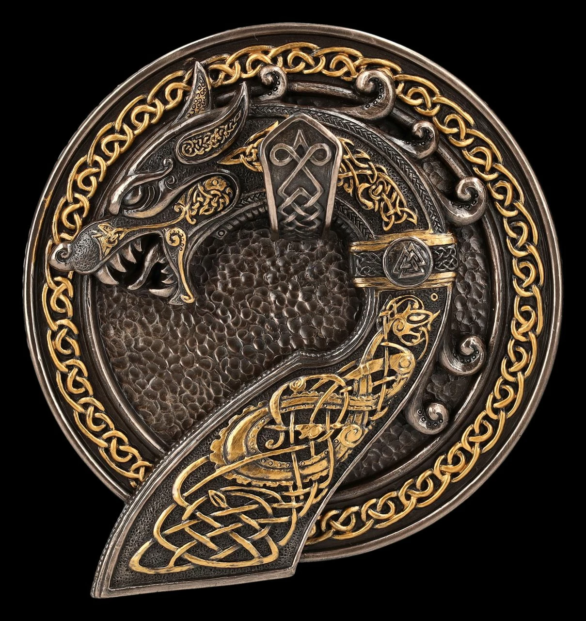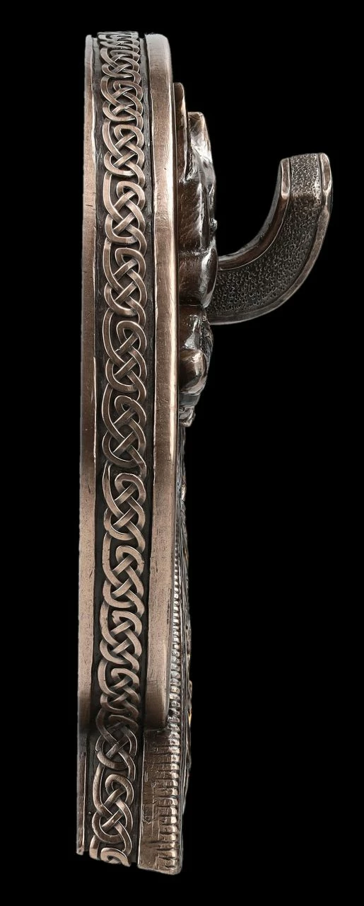 Der fantastische Wikinger Wandhaken mit dem keltischen Drachen ziert nicht nur jede Garderobe, er ist auch die perfekte Halterung für das Germanische Signalhorn, das allerdings nicht in der Lieferung enthalten ist. Der reich verzierte Wandhaken mit dem Drachen stammt aus der Studio Collection von Veronese. Der 17 cm hohe, 16 cm breite und 5,5 cm tiefe Wandhaken ist detailreich aus Kunststein (Polyresin) gefertigt und aufwändig bronziert und coloriert. Der prächtige Wandhaken ist also nicht nur für Wikinger ein fantastisches Geschenk, sondern auch für jeden, der sich für die Nibelungensage interessiert. Das Signalhorn gehörte in der Sage um Siegfried auch zum Schatz der Nibelungen und zeigt im keltischen Stil Siegfrieds berühmten Kampf mit dem Drachen. Das funktionsfähige Signalhorn kann in unserem Shop ebenfalls erworben werden.