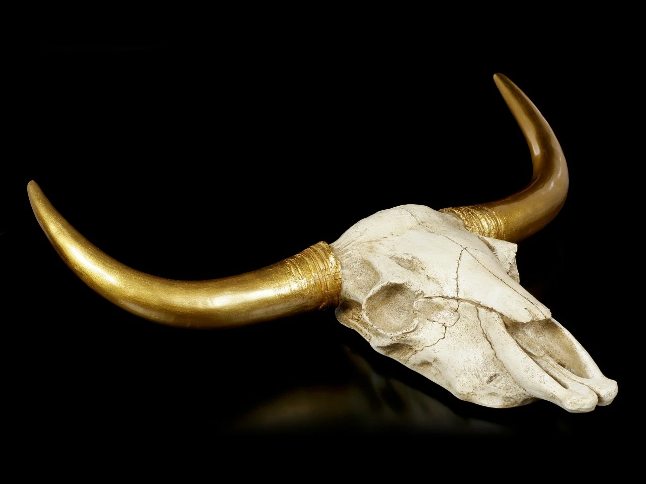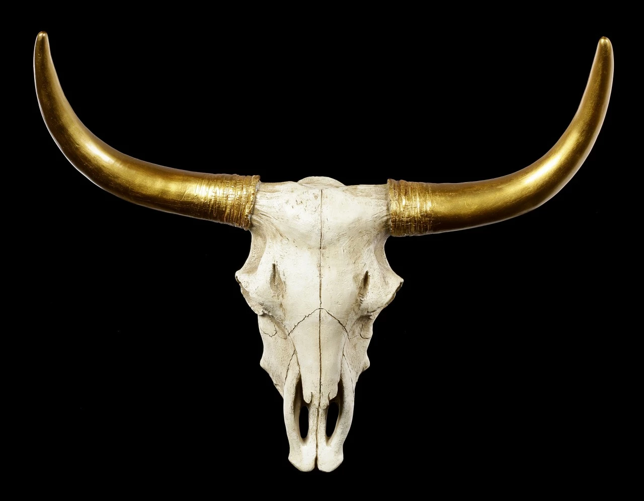 Der handbemalte Büffel Schädel mit glänzenden goldenen Hörnern ist eine wunderbare Wanddeko – nicht nur für jeden Western Fan. Der Schädel aus Kunststein (Polyresin) kann zu dekorativen Zwecken auch auf ein Sideboard gelegt werden und besticht durch die edle Bemalung.