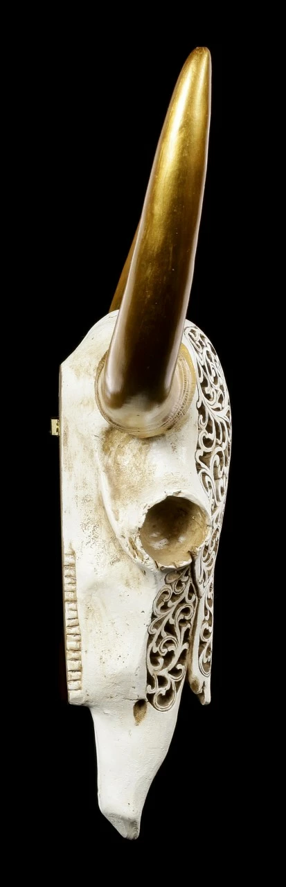Büffelschädel mit Ornamenten und goldfarbenen Hörnern