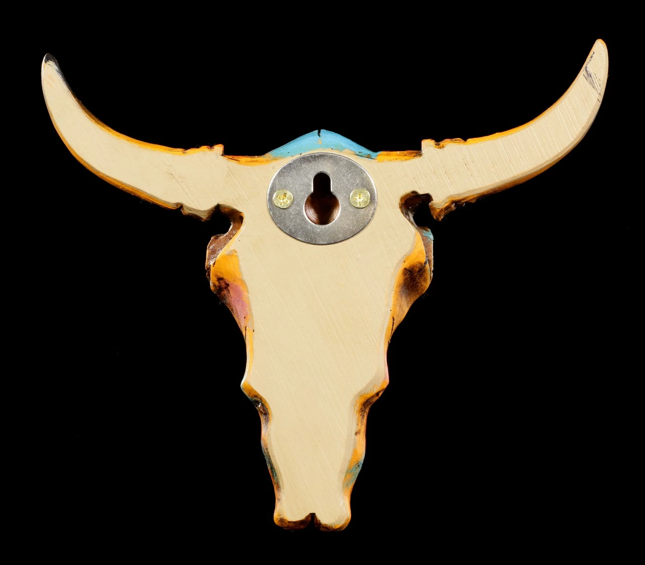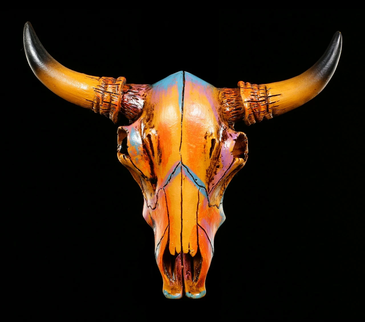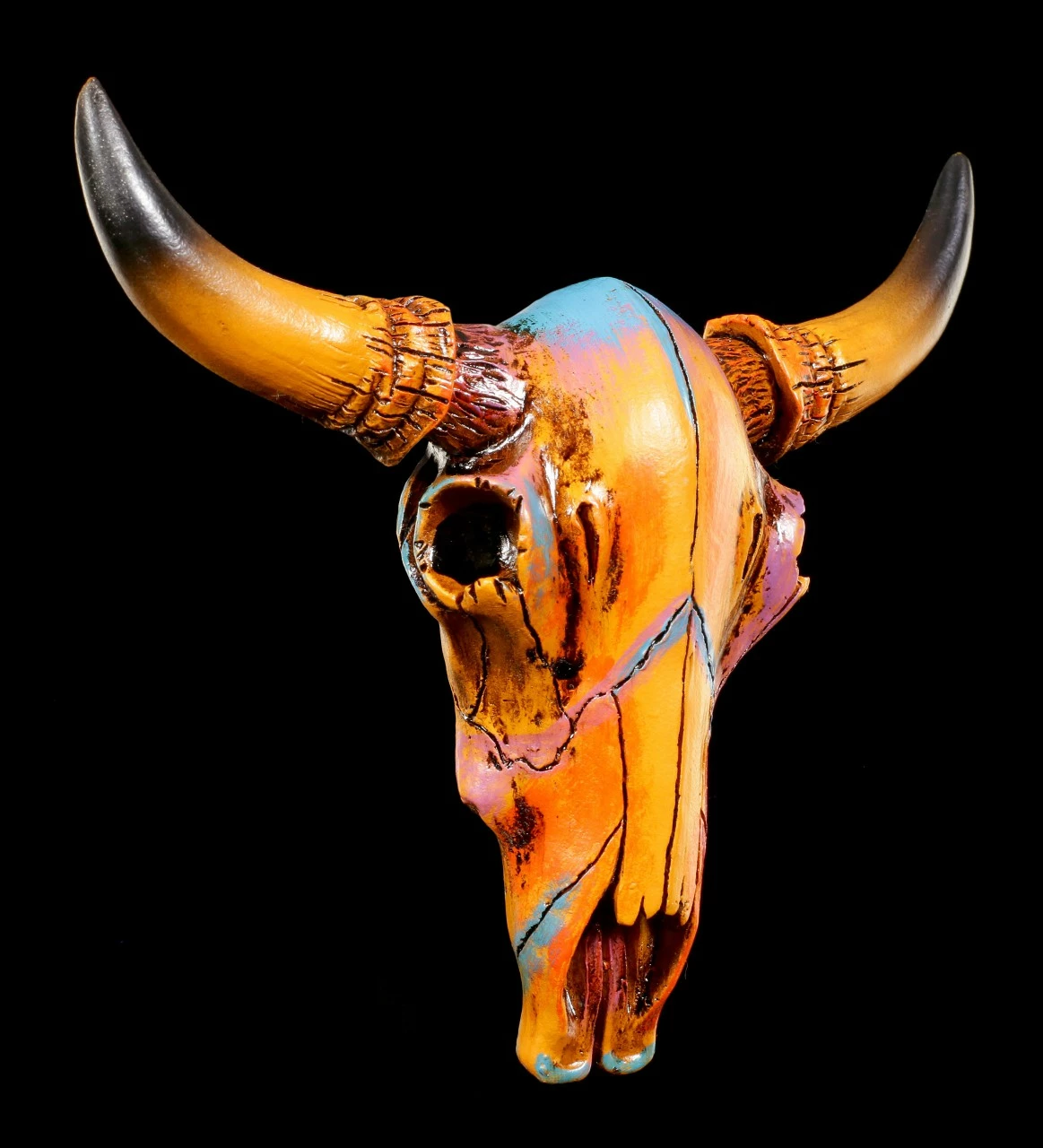 Verschenken Sie einen Hauch vom Wilden Westen. Dieses Wandrelief eines Rinderschädels mit Indianerbemalung lässt den Beschenkten von der Freiheit der Prärie träumen.