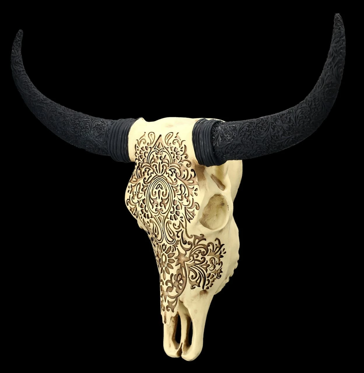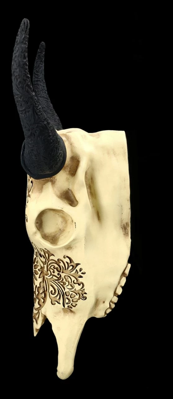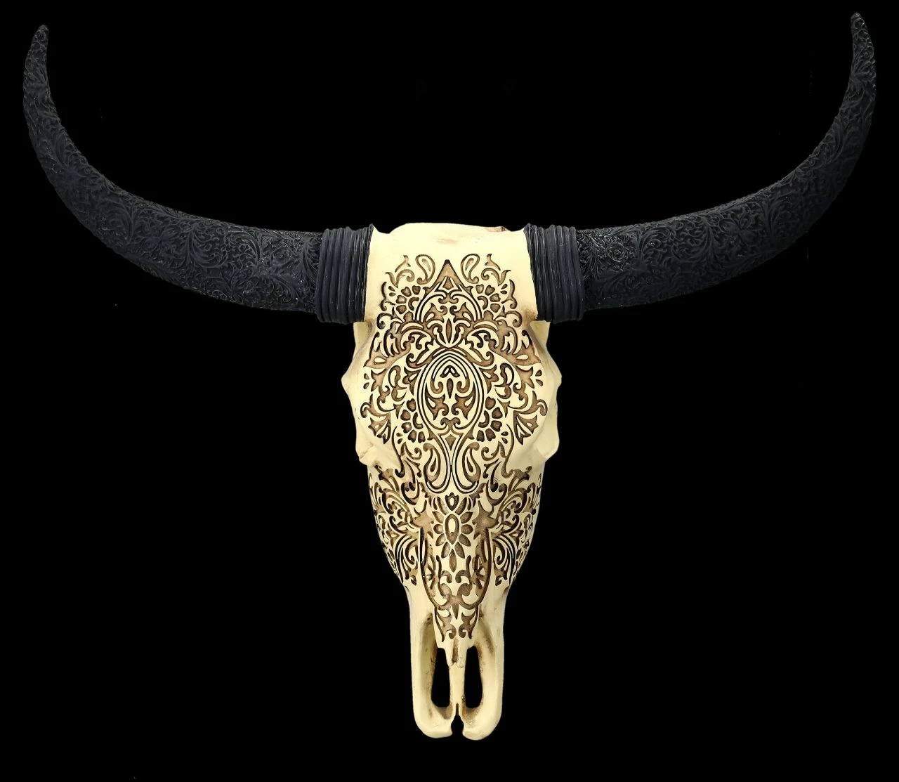 Als hätte sich ein Künstler viel Zeit genommen, um in filigraner Kleinarbeit einen knochenfarbenen Rinderschädel mit großen Hörnern mit kunstvollen Mustern zu verzieren. Der 30 cm hohe, 33 cm breite und 9 cm tiefe Rinderschädel wurde aufwändig aus hochwertigem Kunststein (Polyresin) gefertigt und von Hand bemalt. Der Rinderschädel mit den barocken Verzierungen ist als Wandrelief zum Hängen ein fantastischer Blickfang und gibt jedem Ambiente ein richtiges Western-Feeling.
