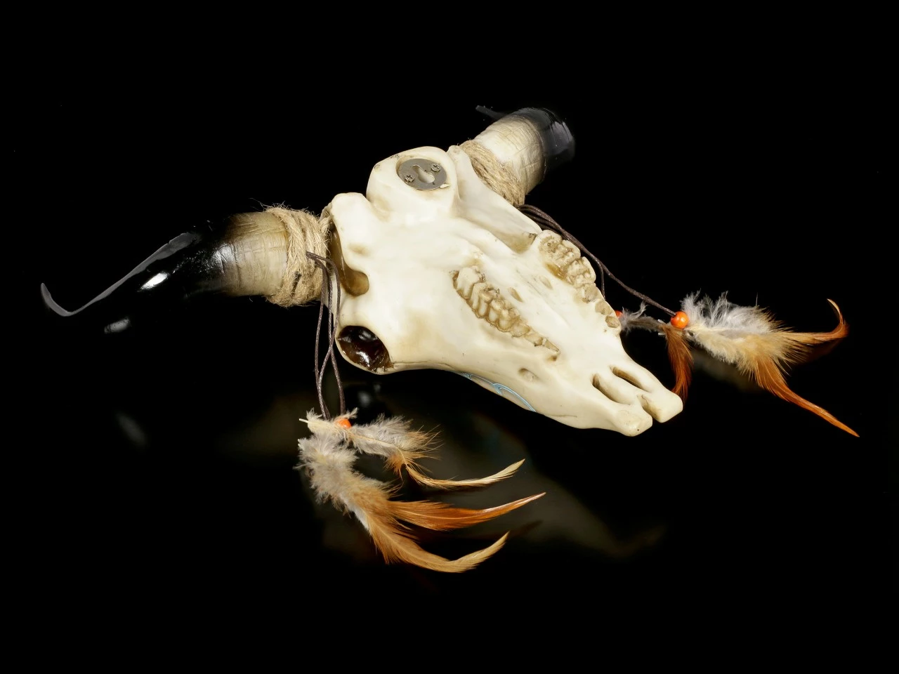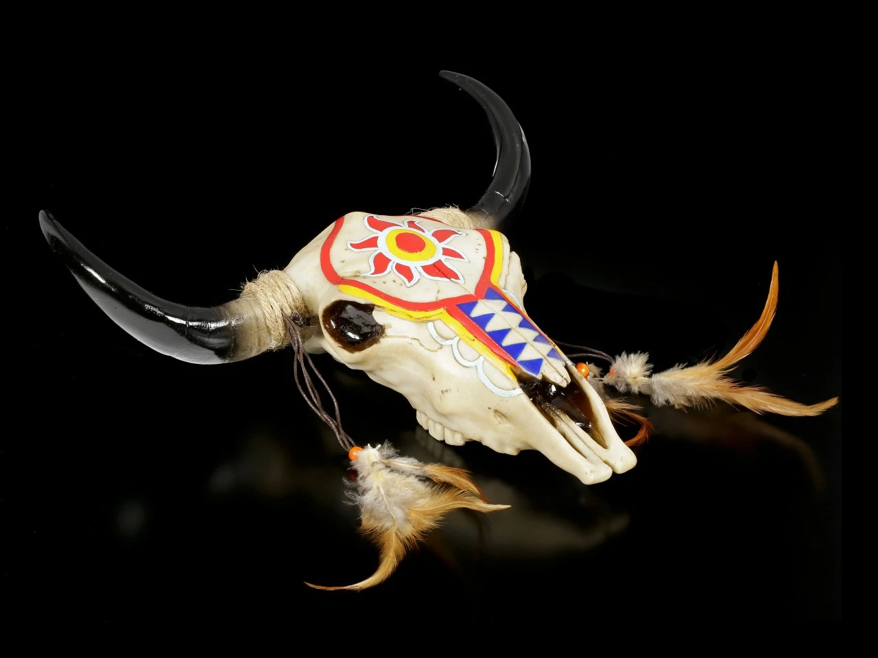 Sind Sie ein Western Fan? Mögen Sie die indianische Kunst? Oder sind Sie auf der Suche nach einer ungewöhnlichen Wanddeko? Dann ist der Stierschädel im Stil der indianischen Kunst aus handbemaltem Kunststein (Polyresin) perfekt für Sie! Der Schädel mit Sonnenmotiv lässt sich auch dekorativ auf einem Sideboard platzieren.