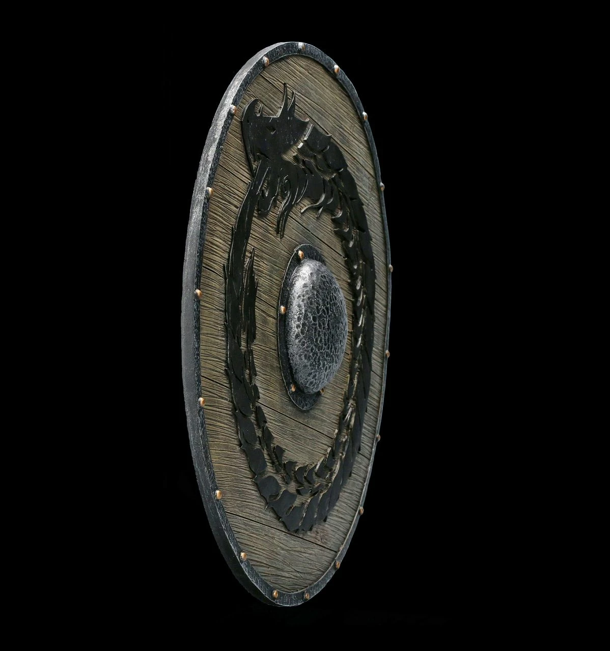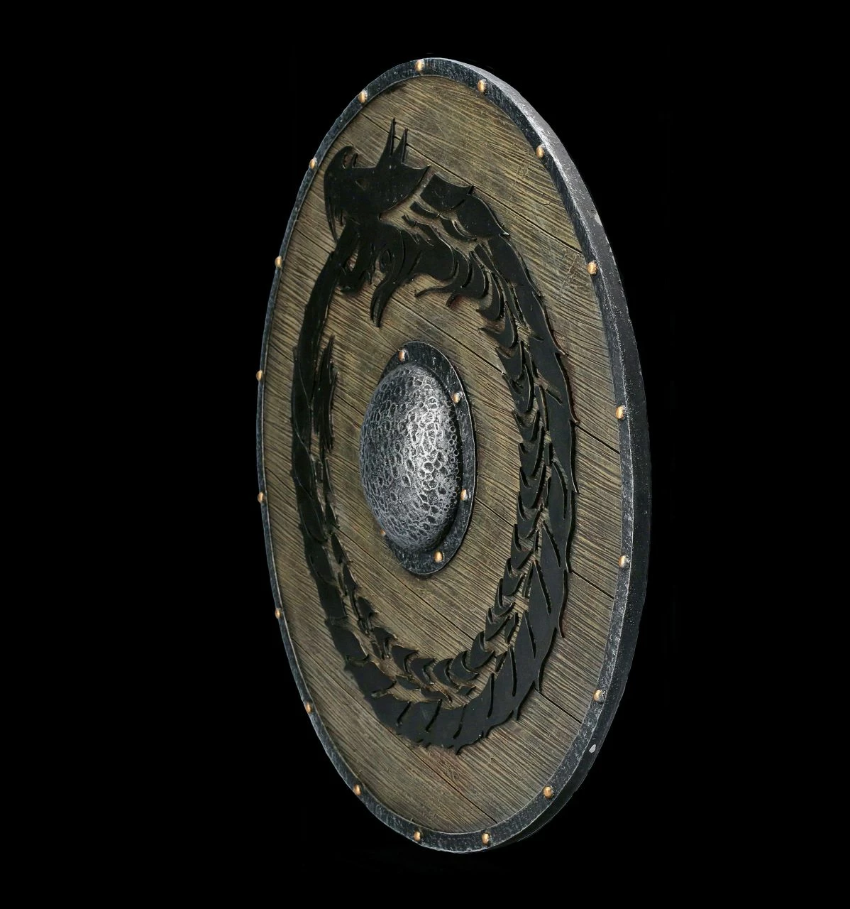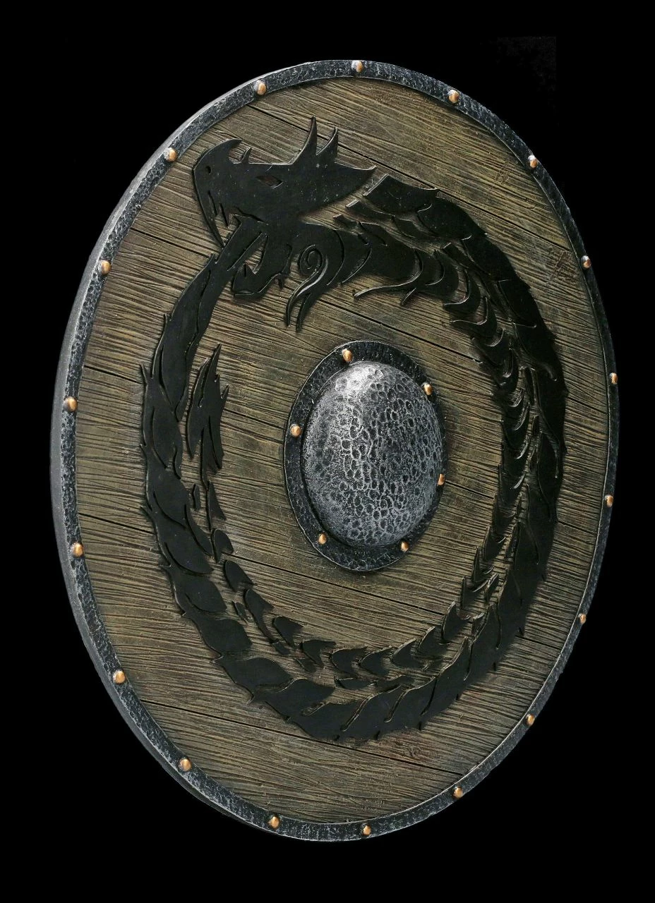 Wie aus einem edlen Hartholz gearbeitet und mit Eisenbeschlägen versehen, sieht dieses detailreiche Wikinger Schild mit dem fein herausgearbeiteten schwarzen Drachen aus. Das ausgefallene Wikinger Schild ist sorgfältig aus Kunststein (Polyresin) gearbeitet und sehr realistisch handbemalt. Mit seinem Durchmesser von 31,5 cm und der Tiefe von 3 cm schmückt das imposante Wandrelief jedes Zuhause eines Wikingers.