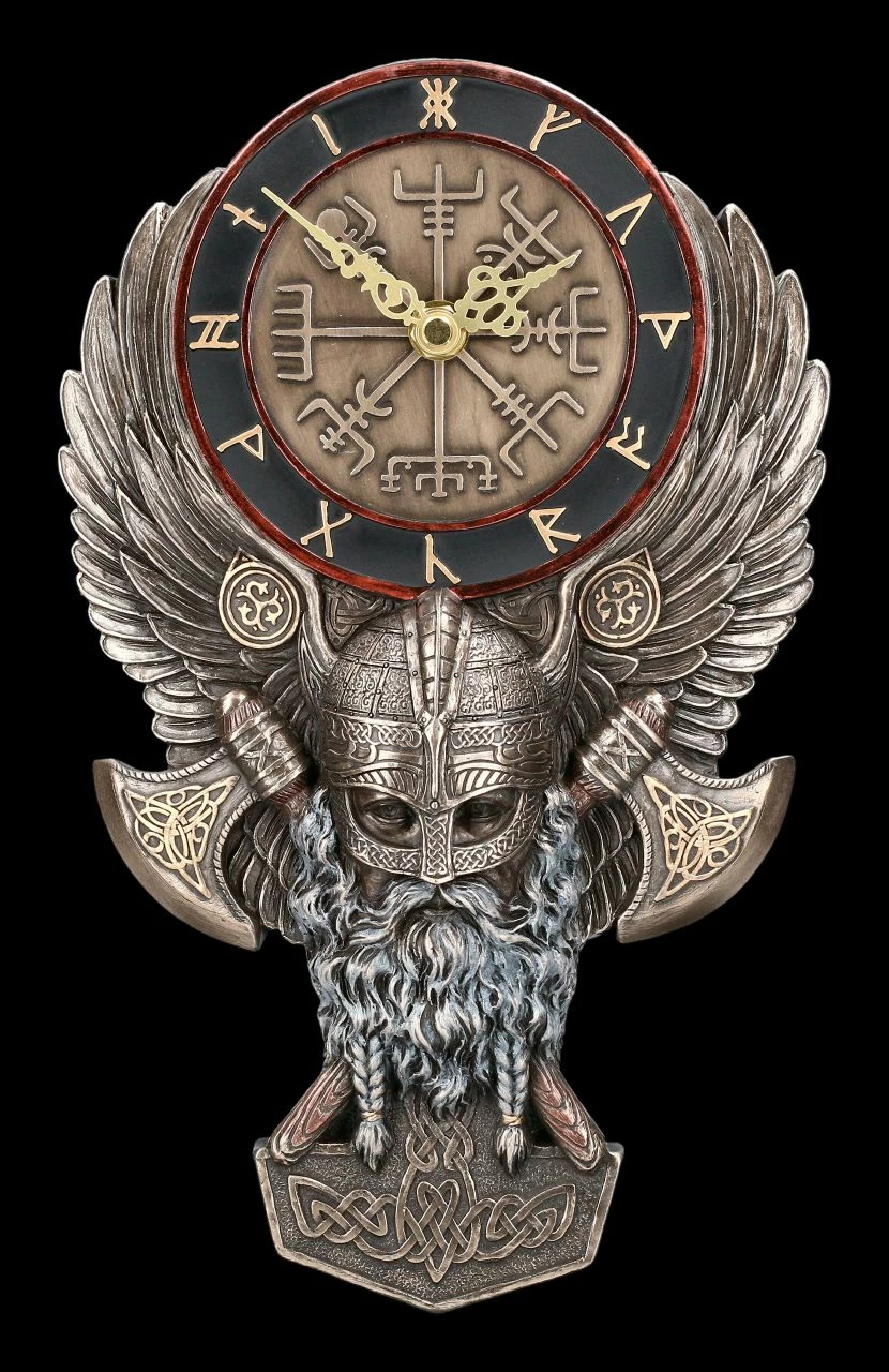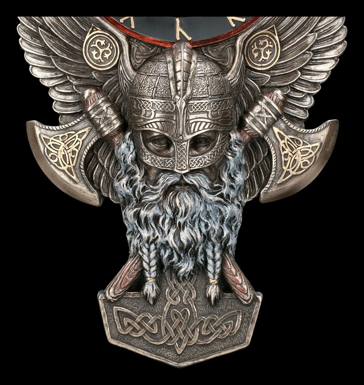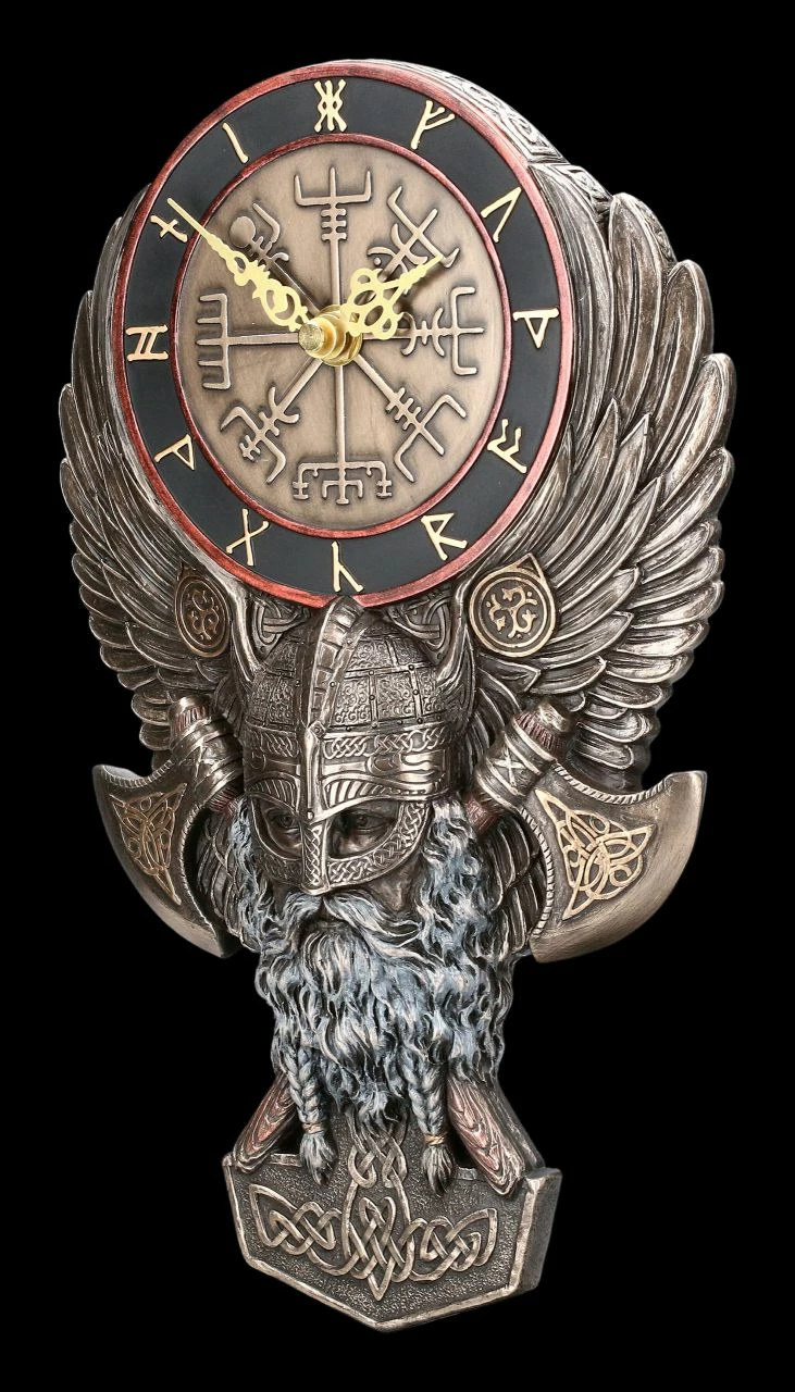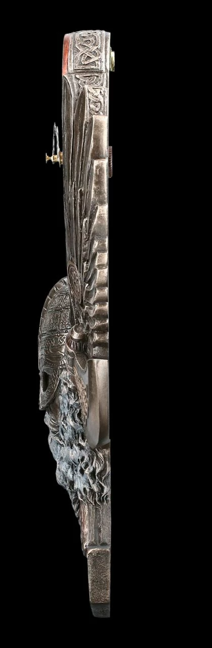 Heute möchten auch Wikinger wissen, was die Stunde geschlagen hat. Außergewöhnlich und dekorativ ist die Wanduhr mit dem Runenkompass Vegvisir in der Mitte und den Runen als Zeitangabe, die zwischen Flügeln über dem Helm eines Wikingerkopfes angebracht ist. Die faszinierende Wanduhr Vegvisir aus der Studio Collection von Veronese ist sorgfältig und detailreich aus Kunststein (Polyresin) gefertigt und edel bronziert & coloriert und benötigt 1 x AA Batterie (Batterie ist nicht in der Lieferung enthalten). Die außergewöhnliche Wanduhr ist zum Hängen und hat eine Höhe von 29 cm, eine Breite von 18,5 cm und eine Tiefe von 4 cm. Sie ist ein fantastischer Blickfang im Heim eines jeden Wikingers und daher auch ein tolles Geschenk.