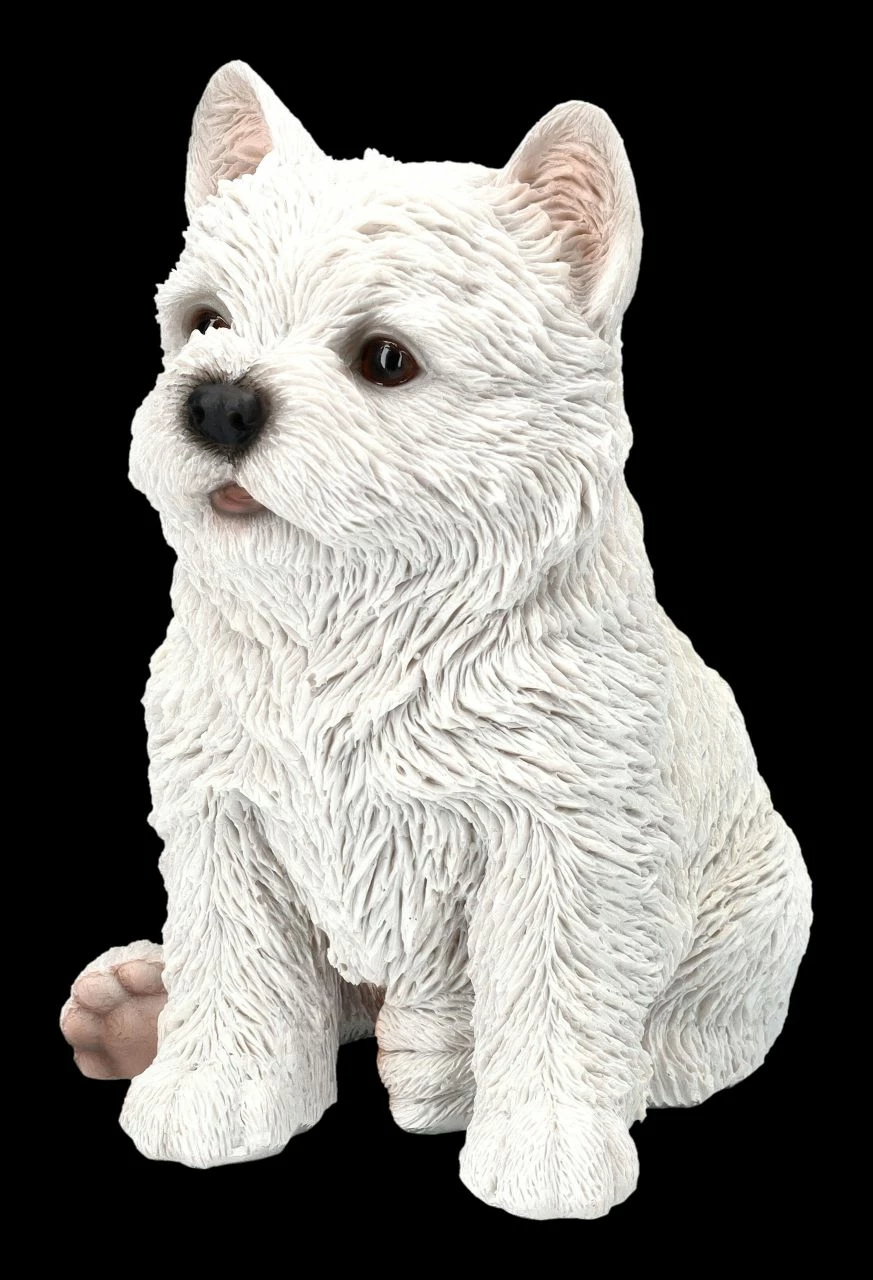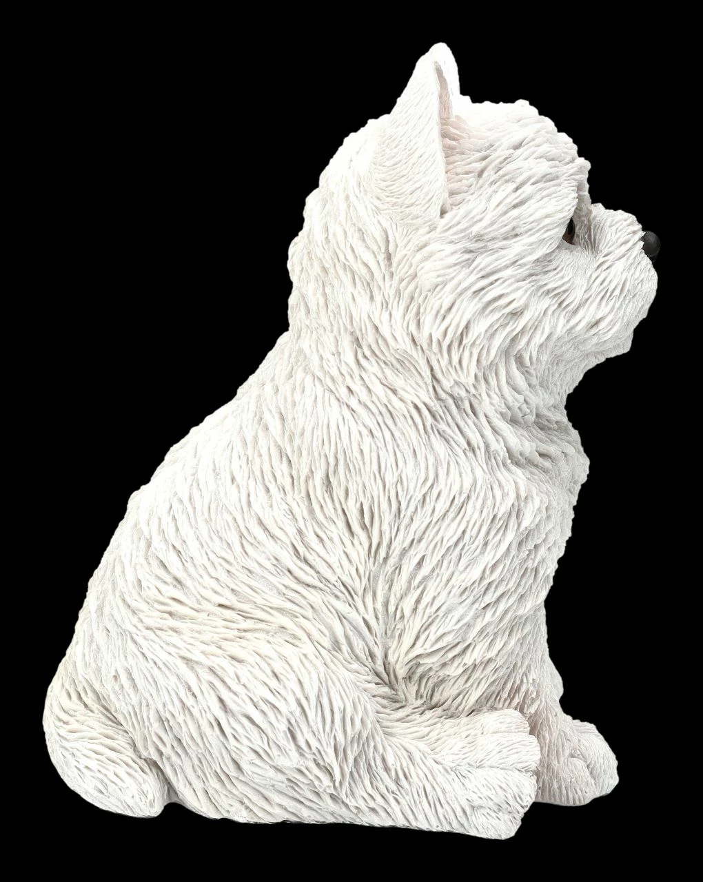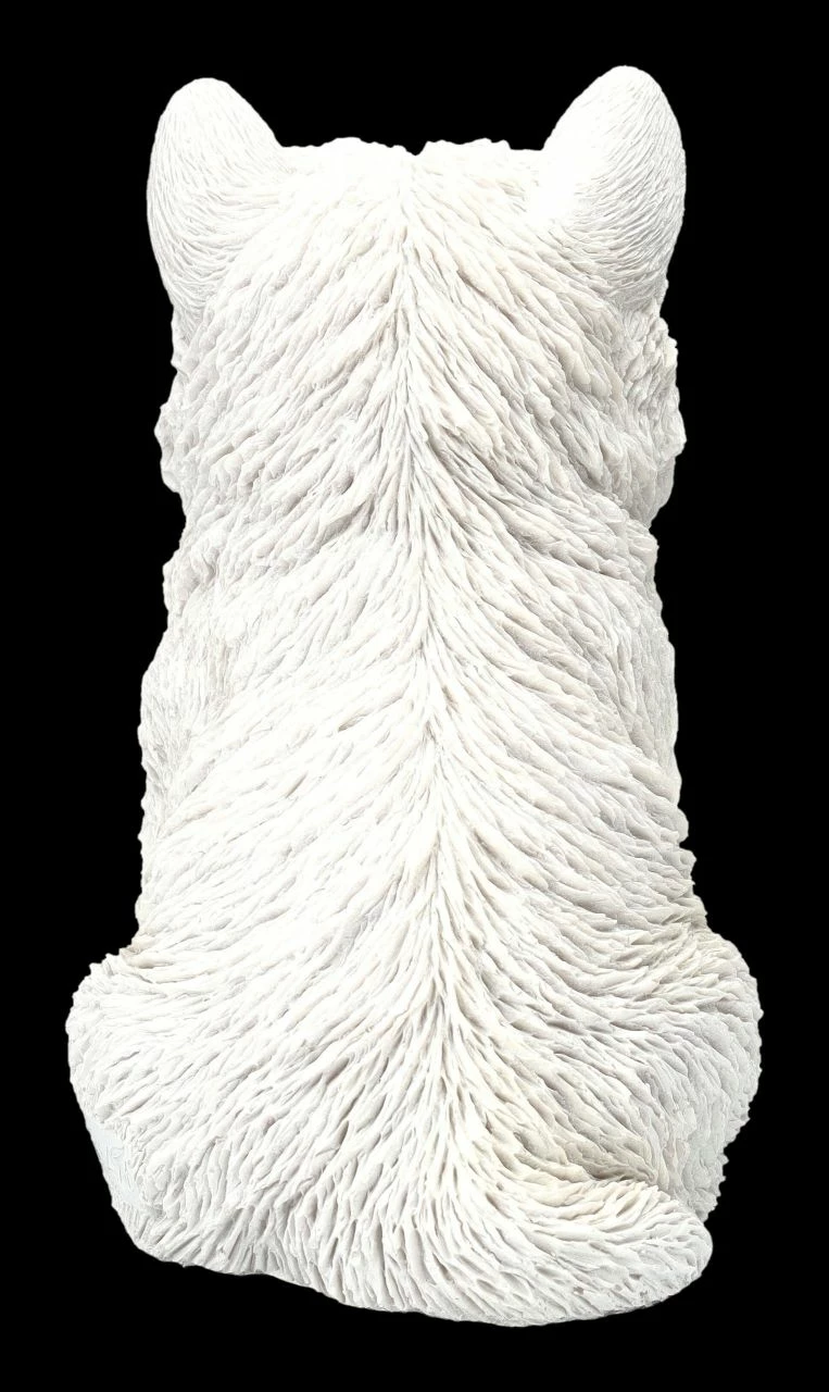 Wer kann diesem niedlichen Westie Welpen widerstehen? Der als unerschrocken und sehr aktiv bekannte West Highland Terrier zählt zu den direkten Nachfahren der alten schottischen Rasse der Jagdterrier. Die weiße Farbe wurde am Anfang als Fehler angesehen, ist aber heute das Markenzeichen der abenteuerlustigen Hunderasse. Der Westie Welpe wurde von Hotant außerordentlich realistisch und detailreich gestaltet. Die 17 cm hohe, 11,5 cm breite und 14 cm tiefe Figur eines Westie Welpen wurde aus hochwertigem Kunststein (Polyresin) gefertigt und mit viel Liebe handbemalt. Die West Highland Terrier-Figur von Hotant ist nicht nur eine tolle Deko, sie ist auch eine hochwertige und fantastische Trophäe für jeden Züchter, Verein oder Zuchtverband und natürlich auch ein perfektes Geschenk für alle Hundefreunde. Denn jagen wird dieser kleine Welpe gar nicht erst lernen….
