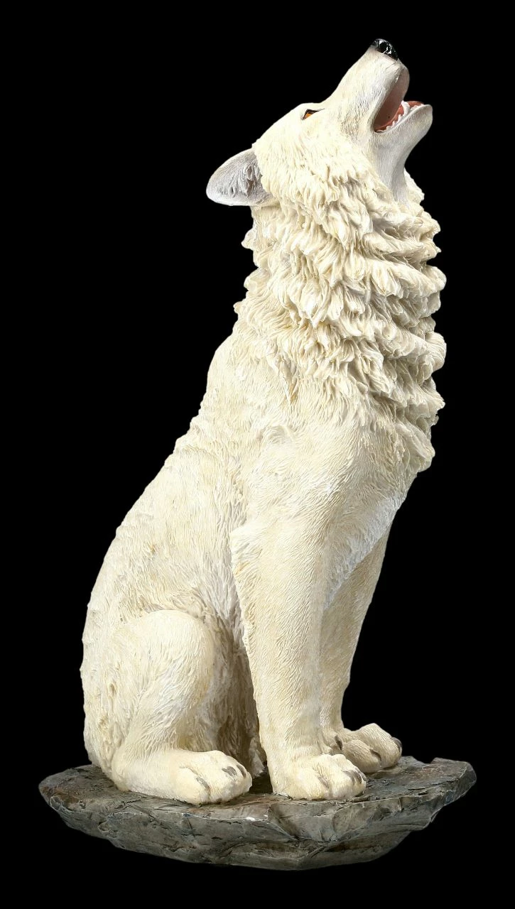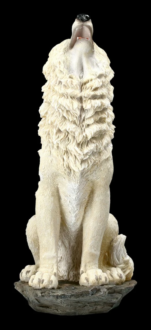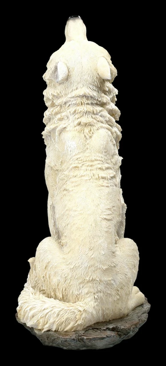 Man kann sein Heulen fast hören, so detailreich in seiner Haltung ist dieser wunderschöne weiße Wolf aus liebevoll handbemaltem Kunststein (Polyresin) gefertigt. Mit seiner Höhe von 42 cm, der Breite von 25 cm und der Tiefe von 18 cm ist dieser imposante und schöne weiße Wolf für jedes Interieur der sofortige Blickfang und durch seine schöne und detaillierte Darstellung das perfekte Geschenk für jeden, der die Ursprünglichkeit der Wölfe liebt.