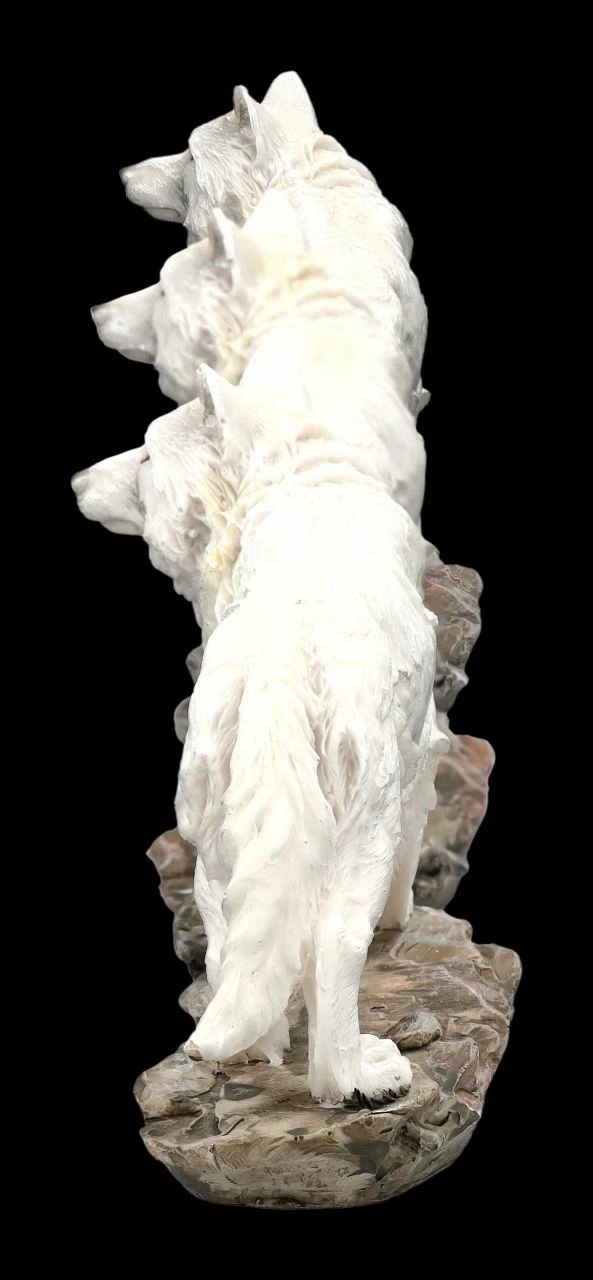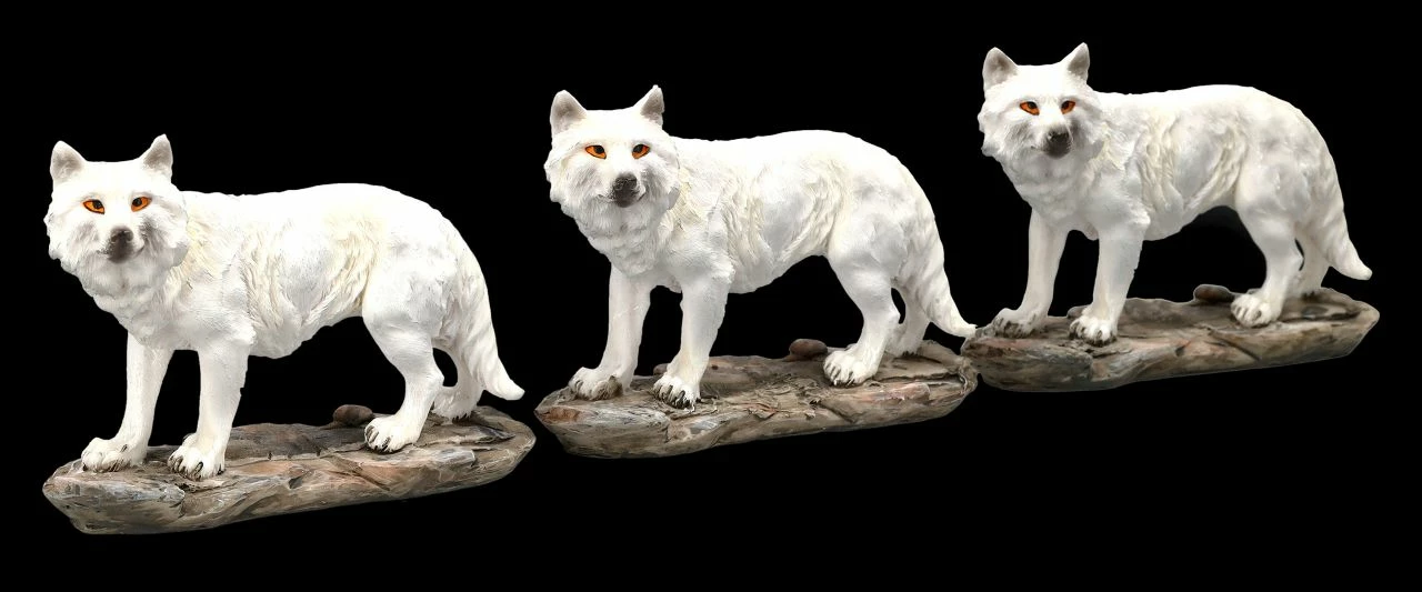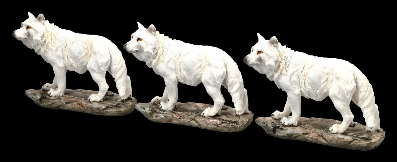 Sie trotzen arktischer Kälte, denn weiße Wölfe leben in unwirtlichen Polarregionen und sind bis heute noch nicht richtig erforscht. Doch jeder Wolfsfreund weiß, dass Wölfe kraftvolle und soziale Tiere sind. Daher sind sie auch ein tolles Geschenk für jeden, der diese Wildtiere schützen möchte. Die drei je 11 cm hohen, je 14,5 cm breiten und je 7,5 cm tiefen stehenden Figuren weißer Wölfe wurden detailreich aus handbemaltem Kunststein (Polyresin) gefertigt. Ein fantastisches 3er Set, das man sich auch mit seinen Wolfsfreunden teilen kann. Viele weitere Wolfsfiguren findet ihr in unserem Shop.
