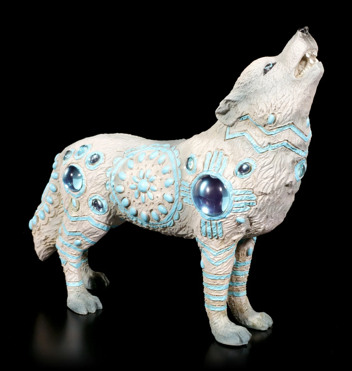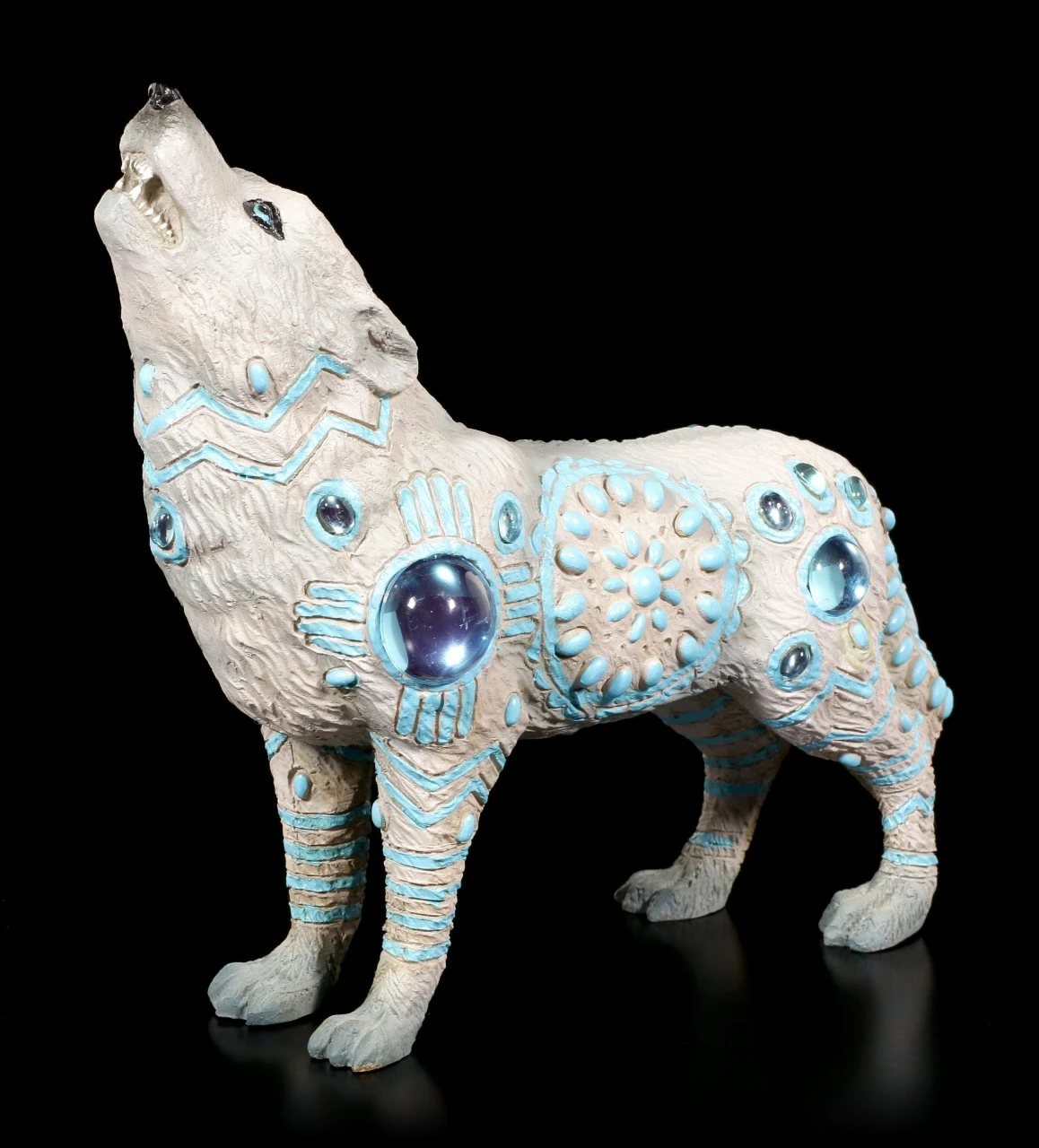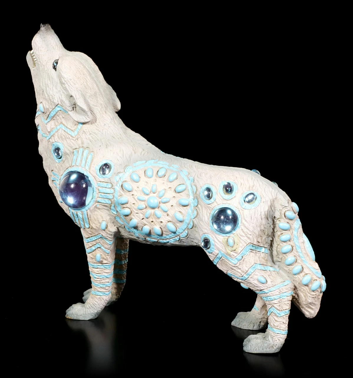 Fantasievoll bemalte heulende Spirit Wolf Figur aus Kunststein. Die weiße Wolf Figur ist mit wundervollen indianischen Symbolen und mit Schmucksteinen verziert. Ein traumhafter Anblick!