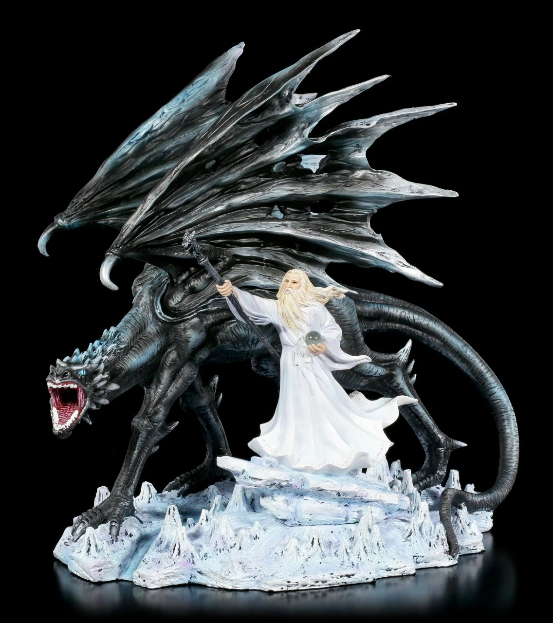 Diese wunderbare Kunststein Figur ist eine Hommage an Merlin, den größten und mächtigste Zauberer aller Zeiten. Selbst der große schwarze Drache an seiner Seite wagt es nicht sich ihm in den Weg zustellen, sondern das Gegenteil ist der Fall. Er begleitet Merlin, er unterstütz und beschützt ihn. Egal ob Sie ein Drachen Fan oder ein Magiekundiger, dieses wunderbare Ensemble sollte auf keinen Fall bei Ihnen fehlen.