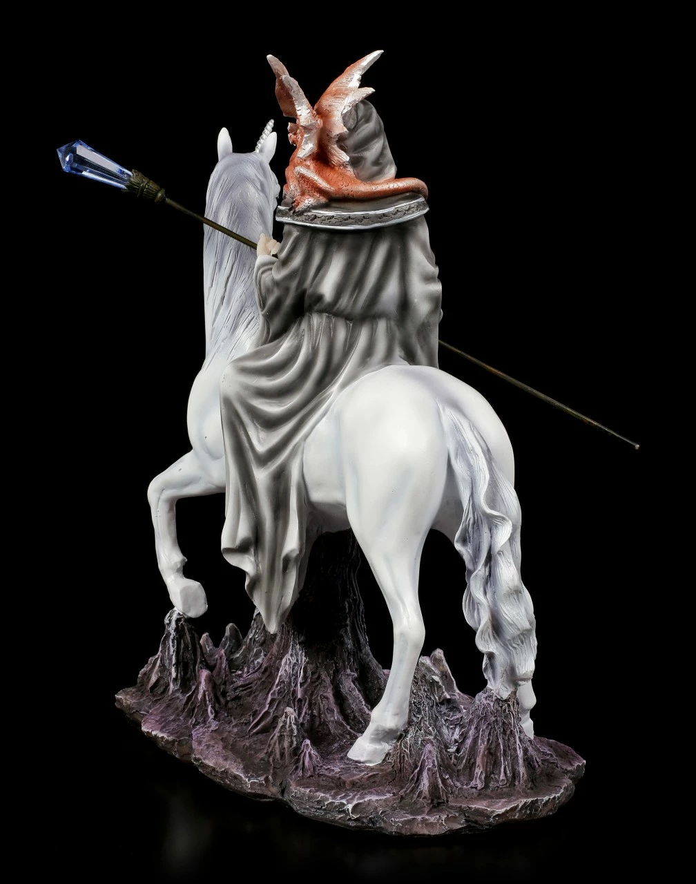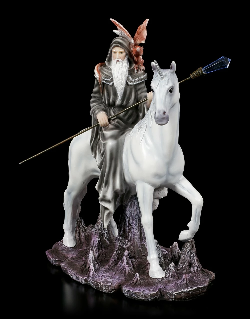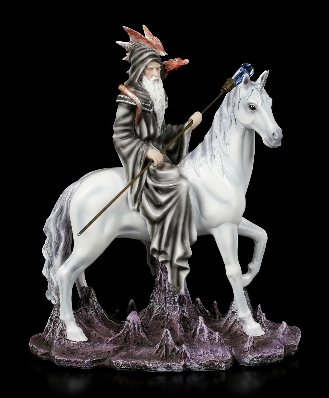 Magische Wesen sind von jeher die treuen Begleiter von Hexen und Zauberern. Der mächtige graue Zauberer hat als Reittier eines der selten gewordenen Einhörner und sein Wächter ist ein junger Feuer Drache. Der Zauberstab des Magiers ist mit einem umwerfenden Kristall verziert. Die handbemalte Figur aus Kunststein (Polyresin) sollte in keiner Sammlung fehlen.