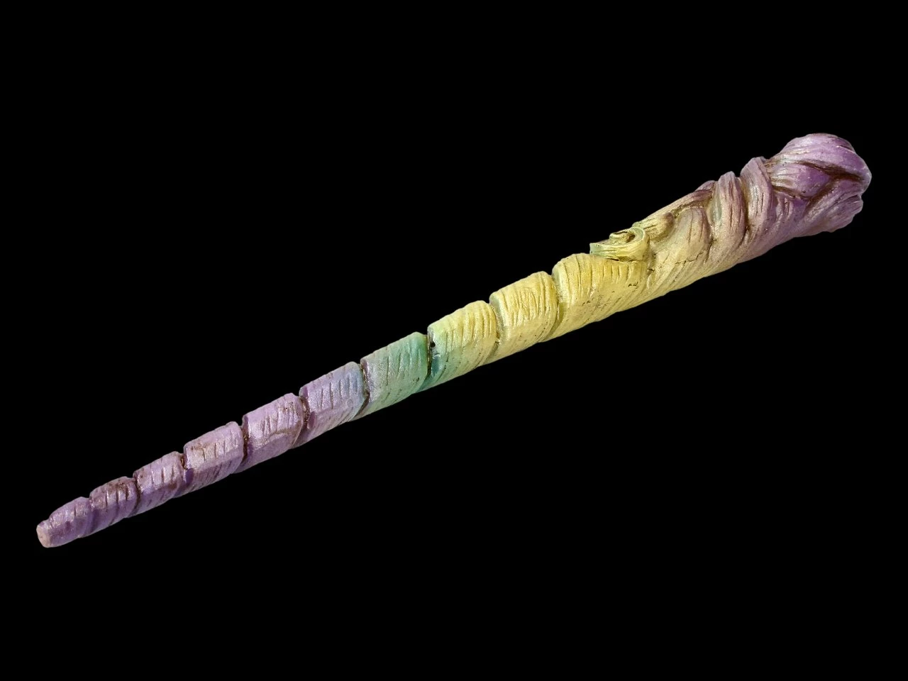 Ein wunderschöner Zauberstab für Elfen, Feen, Hexen und Magier ist dieses magische Horn eines Einhorns. Sehr schön aus liebevoll in zarten Farben handbemaltem Kunststein (Polyresin) gefertigt, liegt er mit der Länge von 24 cm und dem Durchmesser von 2,5 cm gut in der Hand. Ein faszinierend schöner Zauberstab, der als Geschenk sicher viel Freude macht,