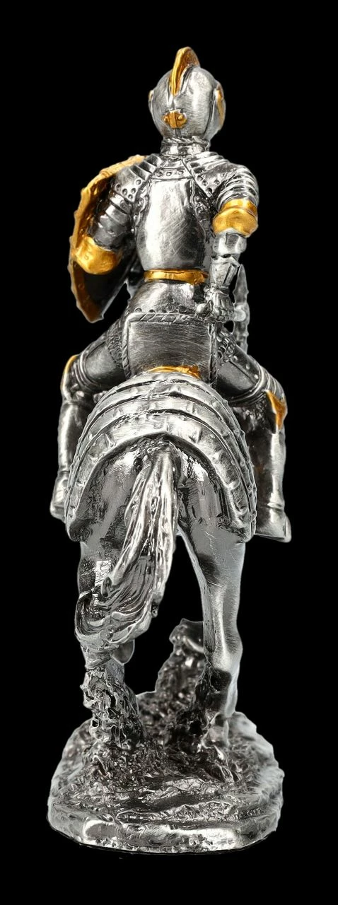 Die nächste Runde im Turnier steht an und hier geht es nun darum, mit der Streitaxt den gegnerischen Turnierkämpfer vom Pferd zu stoßen. Welcher Ritter ist der geschickteste Reiter, der die engen Kurven mit seinem prachtvoll ausgestattete Pferd am besten schafft? Der detailreich aus Zinn gefertigte und sorgfältig von Hand bemalte prächtige Ritter mit Pferd und Streitaxt stammt aus der Historical Knights Collection von Veronese. Die goldenen Akzente geben dem silberfarbenen Zinn-Ritter ein wahrlich edles Aussehen. Am linken Arm hält der Ritter sein Schild und in seiner rechten Hand die Streitaxt. Er sieht den Gegner auf sich zukommen und macht sich bereit, sich im Turnierkampf mit dem anderen zu messen. Der 10,5 cm hohe, 9 cm breite und 3 cm tiefe Ritter ist nicht nur eine wunderbare Ergänzung jeder Zinnfiguren-Sammlung, er ist auch ein perfektes Geschenk für jeden Ritter. Aus dieser Serie gibt es in unserem Shop weitere Zinn-Figuren, mit denen jeder Ritter sein eigenes Turnier ausrichten kann.