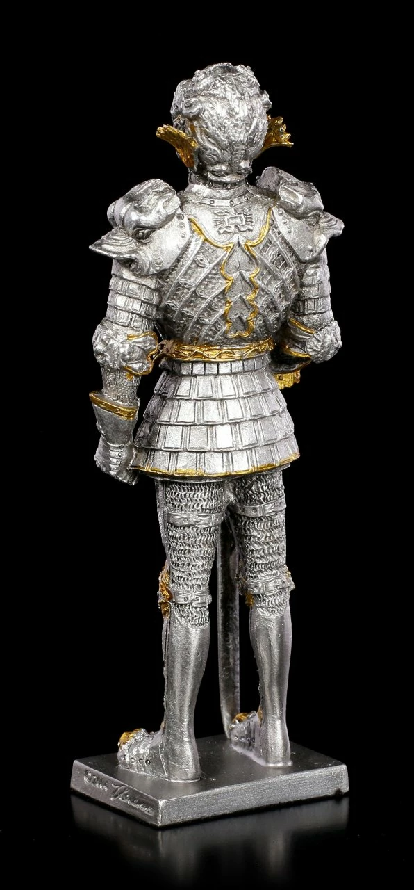 Der kleine Zinnritter aus der Serie Myth & Legends – Historical Knights von Veronese ist detailreich verziert und zeigt eine Rüstung mit Drachenhelm. Die zinnfarbene Ritter Figur steht auf einem kleinen Sockel und ist mit goldenen Details versehen. Ergänzen Sie Ihre Zinn Ritter Sammlung mit diesem umwerfenden Stück.