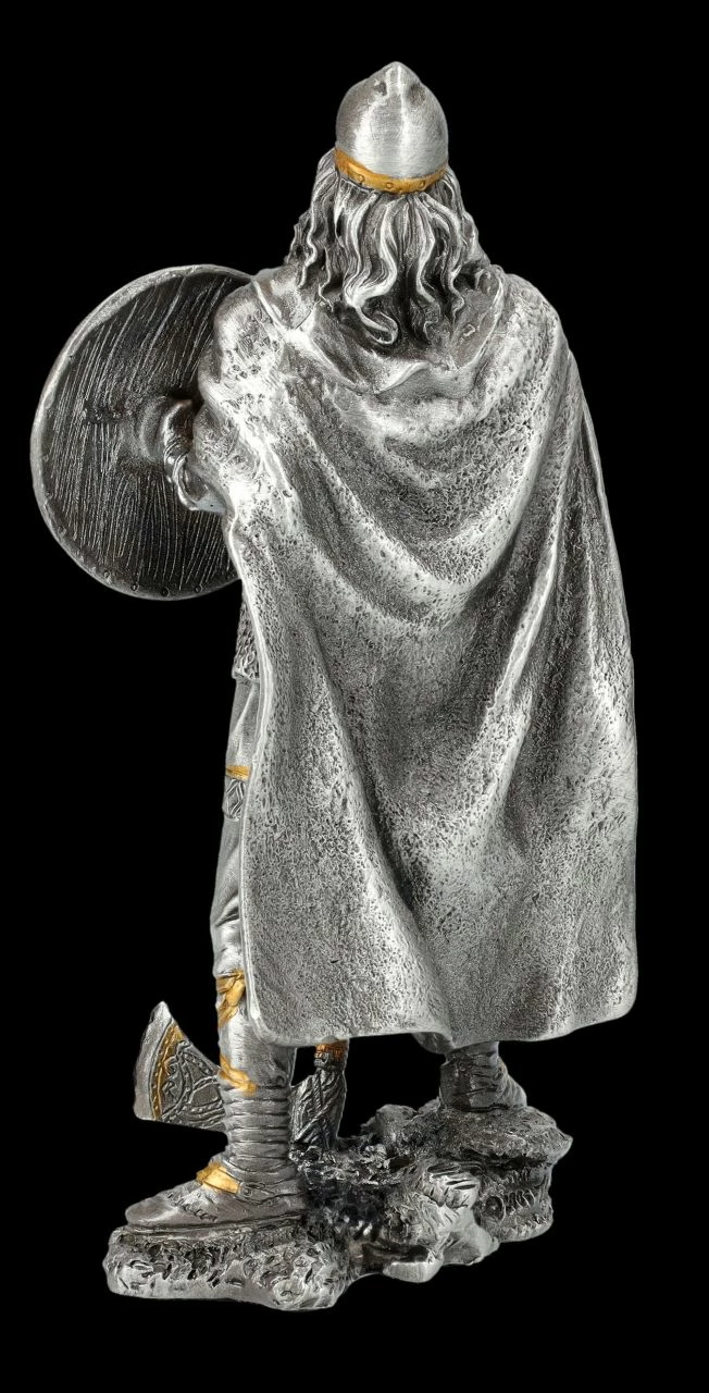 Die rechte Hand auf die Streitaxt gestützt und mit entschlossenem Blick steht dieser Wikinger in voller Rüstung auf seinen Einsatz wartend da. Mit der linken Hand hält der Wikinger sein rundes Schild hoch. Die wunderbar detailreiche Zinnffigur eines Wikingers mit Axt und Schild stammt aus der Historical Knights Collection von Veronese. Sie ist 11 cm hoch, 5 cm breit und 4,5 cm tief. und wurde mit feinen goldenen Akzenten von Hand bemalt. Sie wird inklusive Geschenkkarton verschickt und ist damit ein perfektes Geschenk für Wikingerinnen und Wikinger und natürlich für alle Sammler von Zinnfiguren..